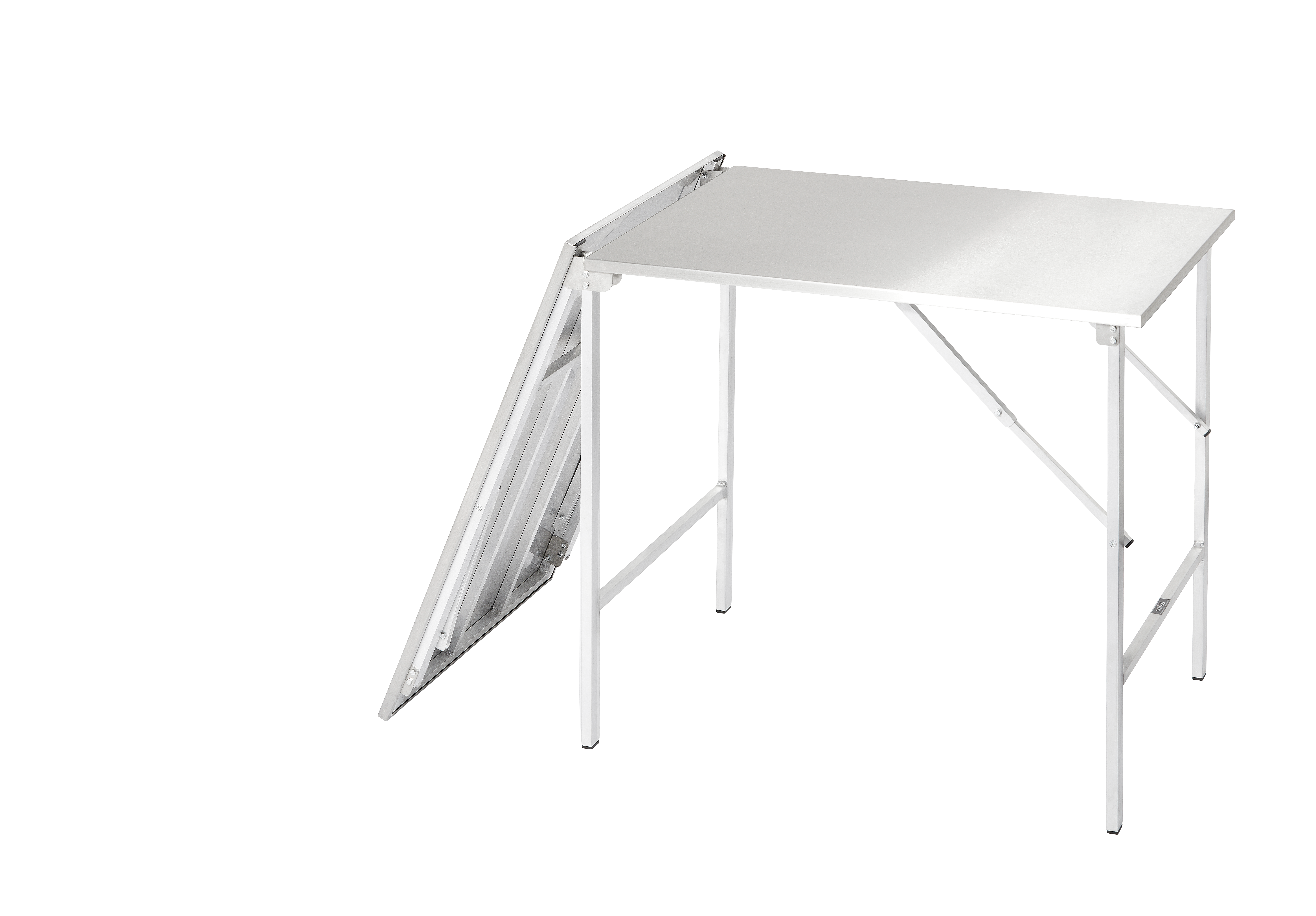 Der klappbare Arbeitstisch aus Edelstahl ist für die Gastronomie-, Catering- und Veranstaltungbranche entwickelt worden. Geeignet für den Innen- und Außenbereich ist der Tisch für professionelle Gastronomiearbeiten die ideale Wahl. Eine hohe Mobilität ist durch das klappbare Gestell, das geringe Gewicht von 23 kg sowie die kompakten Abmessungen im zusammengeklappten Zustand gewährleistet. Trotz dieser Eigenschaften ist der Arbeitstisch äußerst belastbar (Belastbarkeit pro Platte 80 kg).Das leichte aber stabile Untergestell ist schnell ein- und ausgeklappt. Das aus Alu gefertigte Untergestell hat eine Dicke von 2 mm und ist damit für höchste Ansprüche angefertigt.