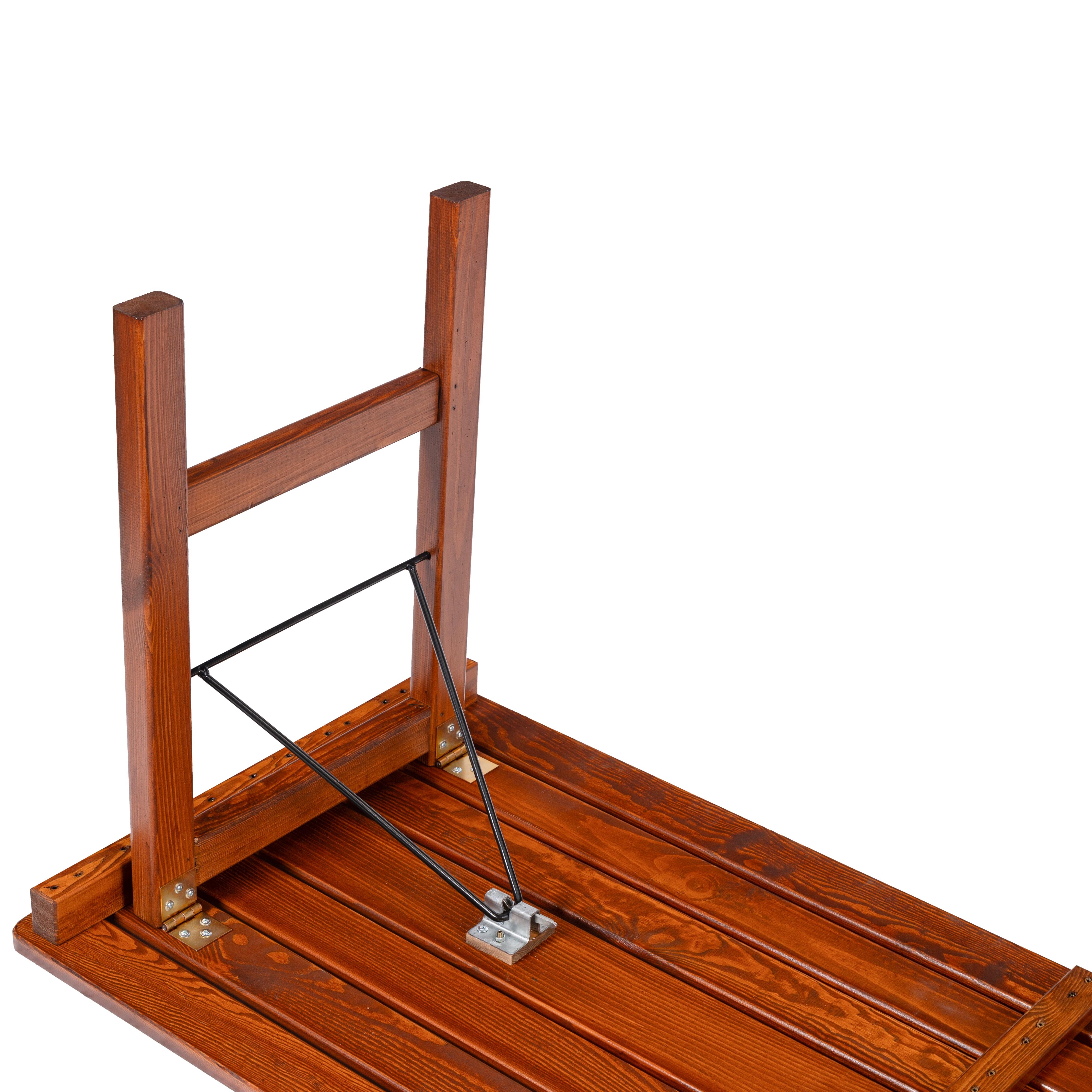Soll es etwas eleganter auf dem Gartenfest zugehen, dann ist die Vollholzgarnitur die richtige Wahl. Das dunkelbraune klappbare Holzuntergestell sieht nicht nur besonders schick aus, es ist auch besonders praktisch, da es wie bei einer Standard Bierzeltgarnitur klappbar ist. Dadurch lässt sich die Garnitur mühelos und platzsparend verstauen.Die hochwertige Verarbeitung sorgt für Standfestigkeit und Langlebigkeit, wodurch die Garnitur auch hohen Belastungen problemlos stand hält.